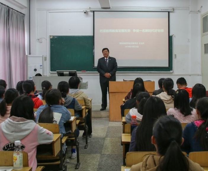 在讲课中,王立兵书记从引导学生深入学习全国教育大会精神入手,分别介绍了当前我国教师教育的发展趋势、目前思想政治教育专业所面临的形势和挑战,阐明了高等教育高质量发展背景下我校的战略定位、奋斗目标和战略部署,勉励广大新生找准定位,早作规划,培养学习兴趣,顺势而为,争做一名新时代的好老师。