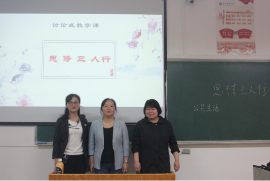 “三人行,必有我师焉”,为贯彻习近平总书记在思想政治理论课座谈会上的讲话精神,争做新时代“六要”的优秀思想政治理论课教师,“思想道德修养与法律基础”教研室创新教研活动深入开展。2019年5月17日上午第二节课,在博学楼520教室,“思想道德修养与法律基础”教研室刘琼、蔡潇、汪晓冰老师与计算机、软件专业的同学们开展了“思修三人行”讨论式课堂。