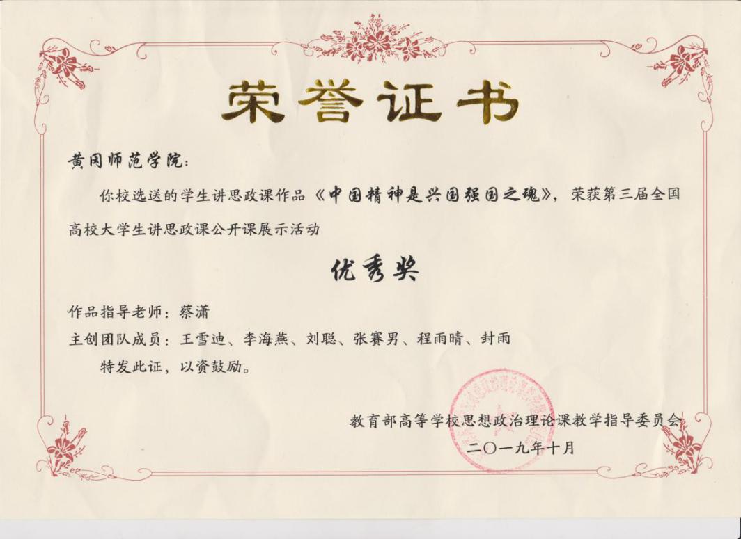 为深入贯彻落实习近平总书记在学校思想政治理论课教师座谈会上的重要讲话精神,隆重庆祝中华人民共和国成立70周年,用习近平新时代中国特色社会主义思想铸魂育人,深入实施“高校思想政治理论课创优行动”,由高校思政课教学指导委员会和有关高校组织开展习近平新时代中国特色社会主义思想大学习领航计划系列主题活动,通过公开课、微电影、夏令营等形式,增强学生学习思政课的积极性、主动性、创造性,不断增强学生对思政课的获得感,打牢学生成长成才的科学思想基础,培养德智体美劳全面发展的社会主义建设者和接班人。我院思政1701班王雪迪同学参赛、蔡潇老师指导的《中国精神是兴国强国之魂》获得优秀奖,进一步增强了我院思政专业同学参加各类教学和征文比赛的信心。