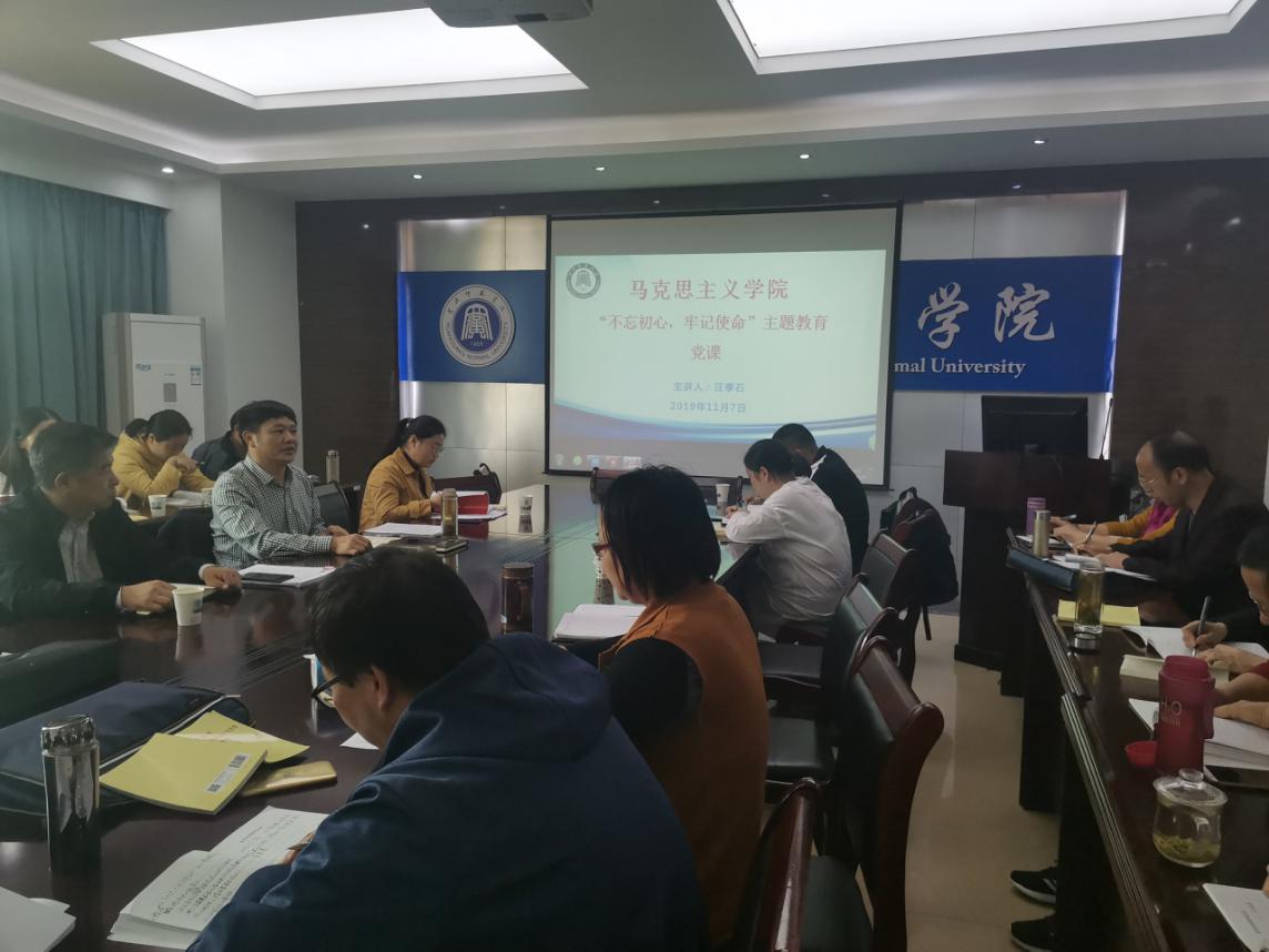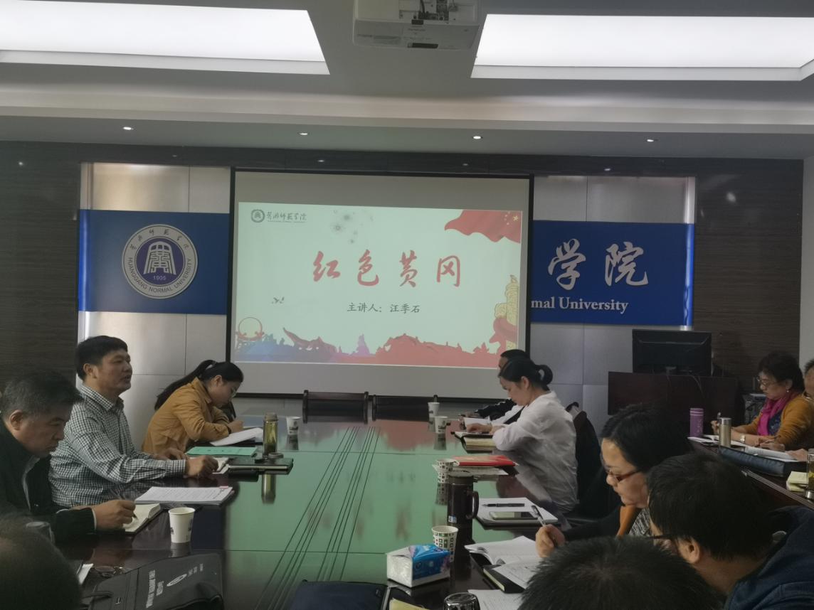 根据学院“不忘初心、牢记使命”主题教育工作部署安排,11月7日下午,学院党总支书记汪季石以“红色黄冈”为题,面向全院党员教师讲授了专题党课。课后,学院总支成员开展对照党章党规检视问题找差距暨调查研究交流会,校第六督导组杜万波、陈海秀同志出席了本次活动。