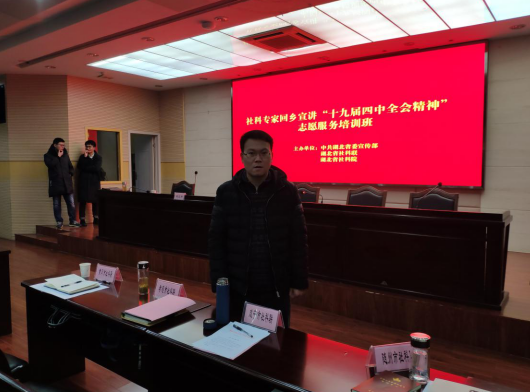 2020年1月8日至9日,bevictor伟德国际1946蔡潇博士、黄杰博士参加了湖北省社会科学界联合会主办的“社科专家回乡宣讲‘十九届四中全会精神’志愿服务培训班”,会议由省社科联党组书记、常务副主席喻立平主持。本次培训班由省社科院党组成员、副院长袁北星介绍回乡宣讲志愿服务经验,省社科联党组成员、副主席陈昀介绍本次活动方案,省委宣传部理论处处长高天琼作动员讲话,武汉科技大学bevictor伟德国际1946院长唐忠义授课。