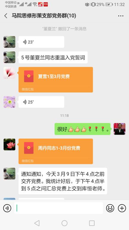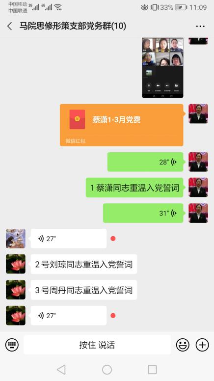 2020年3月9日,bevictor伟德国际1946思修形策党支部进行了微信会议,党支部在线党员同志在组织委员和宣传委员组织下于上午10:30分进行了首次视频会议,虽然是第一次以党支部形式进行视频会议,但是到会的党员同志都没有迟到,并迅速进入了会议议程阶段。本次主题党日活动由全国样板党支部书记蔡潇同志主持,明确了本次主题党日的活动主题是:“慎终如始抓防控,时不我待促发展”,带头领学了习近平总书记《在决战决胜脱贫攻坚座谈会上的讲话》、《习近平在决战决胜脱贫攻坚座谈会上强调:坚决克服新冠肺炎疫情影响 坚决夺取脱贫攻坚战全面胜利》、《中共伟德国际1946bv委员会 常务委员会 2020 年工作要点》、《伟德国际1946bv 2020 年工作要点》。宣传委员周丹同志组织了战疫时期重温入党誓词活动,党支部10名党员同志全部重温了入党誓词,用语音和文字展现了不忘初心、牢记使命的历史任务。组织委员董夏兰同志组织了党支部党费收缴,以2020年1月党费收缴模板进行核算,收齐了党支部共1204元党费。完成规定动作后,党支部就近期学校疫情防控工作进行了讨论,强调要真正下沉一线,以全国样板党支部的标准来建设好党支部,认真完成好近期的网络教学工作,严格遵守学校出台的“十二严禁”、“四个不得有丝毫”、“四清”、“三不”、过好“三关”、提升“三力”、“四不”的疫情防控严格要求,以身作则贯彻好全面从严治党,向学校涌现出来的疫情防控先进学习,不断提升党支部和自身的政治素质、能力素质。