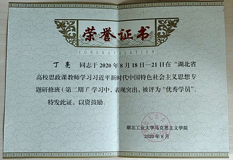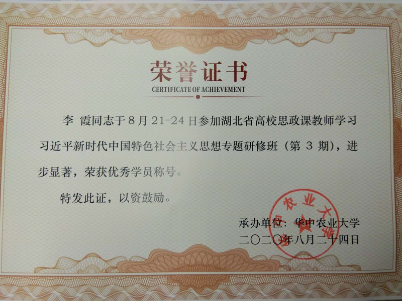 2020年8月17日至24日,bevictor伟德国际1946蔡潇、陈永典、程之胜、丁亮、李霞、雷红等六位老师参加了湖北省高校思政课教师学习习近平新时代中国特色社会主义思想专题研修班并顺利结业,蔡潇、丁亮和李霞三位老师获得“优秀学员”称号。