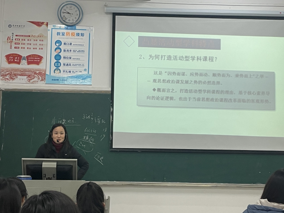 第二次讲座中胡霞英老师展示了她设计的公开课课件,利用讲解的形式让思政专业学生学习到如何在课前进行有趣的导入,调动学生的注意力;如何设置恰当的议题,让学生掌握所学知识;如何挑选具有影响力和权威性的案例材料,让学生树立思想政治学科核心素养和正确的价值取向。