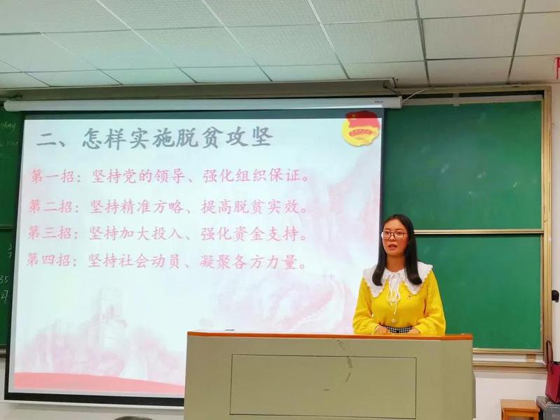 党史宣讲员汪童以“社会主义制度的确立”为主题,带领大家回顾了社会主义制度的探索及确立过程,通过对英雄人物的讲述,让大家领悟了奉献精神的真正内涵,同时也明白了奋斗路上的艰难与不易;党史宣讲员赵静以“点赞改革开放,绽放奋斗青春”为主题带领大家走进了改革开放和社会主义现代化建设时期,改革开放时期的奋斗历程虽充满坎坷,但只要我们万众一心,就一定能攻坚克难;党史宣讲员李婷婷以“决战脱贫攻坚,领悟初心使命”为主题,带大家共同回顾了精准扶贫这条道路上的故事,主要讲述了中国共产党带领中国人民决战决胜脱贫攻坚的伟大历程,展示了我们打赢脱贫攻坚战的重要成果。这些主题宣讲,让我们的入党积极分子能够了解中国共产党这一百年来的光辉历程,看到中国共产党人的无私与无畏,同时也激励我们所有的同学能够传承中国共产党人的初心与使命,提高自身思想政治素养,不断地向党组织靠拢,始终做到青春心向党。