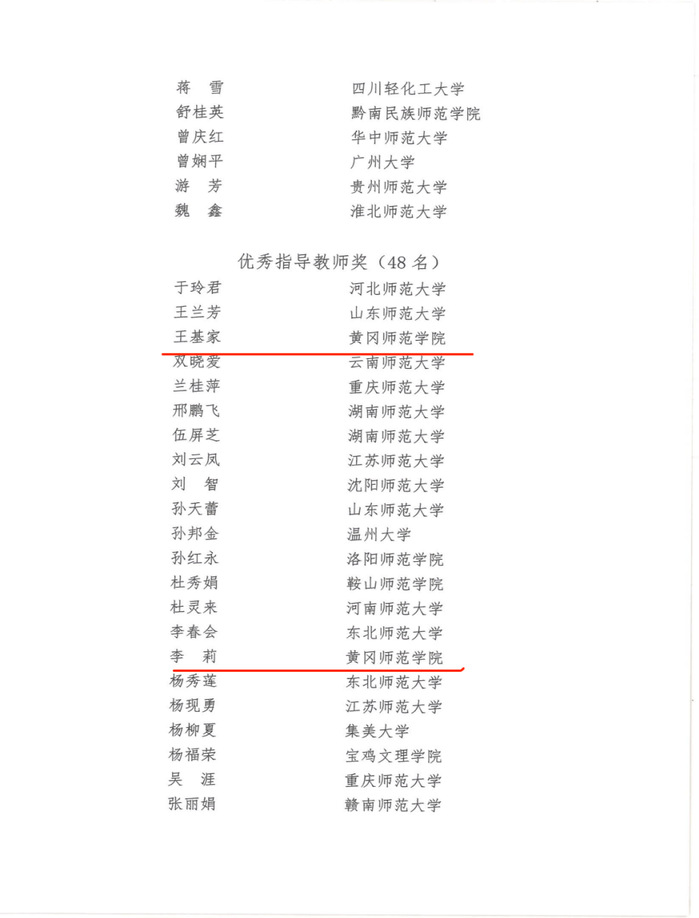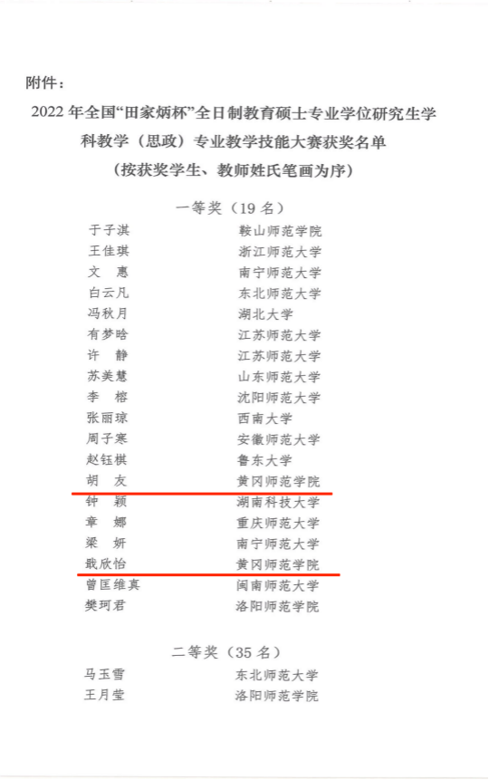 由全国教育硕士专业学位教学指导委员会指导,沈阳师范大学主办的全国“田家炳杯”全日制教育硕士学科教学(思政)专业教学技能大赛于2022年12月22日—24日举办。本次决赛采取线上方式进行,共有来自华东师范大学、陕西师范大学、华中师范大学等高校的177名同学参加。经评审专家评定,我院2021级学科思政研究生胡友和2020级学科思政研究生戢欣怡喜获一等奖。胡友同学的获奖作品《以人民为中心的发展思想》,指导老师为校党委副书记王基家;戢欣怡同学的获奖作品《市场调节》指导老师为李莉教授。王基家、李莉获大赛“优秀指导教师奖”。