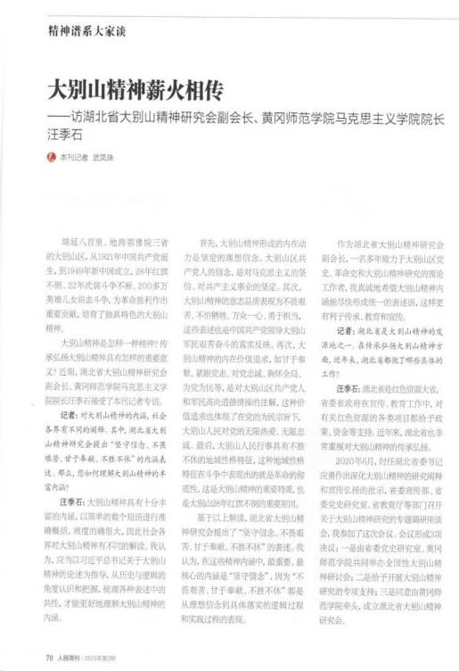 2023年2月,《人民周刊》在“精神谱系大家谈”版块对我院院长汪季石教授做了题为《大别山精神薪火相传》的专访。《人民周刊》是由人民日报社主管、人民日报出版社主办的重要刊物,具有权威性、时代性、新闻性等特点,面向全国党政领导干部发行,是中央各部委、全国各级党政机关及各企事业单位首选读物之一。
