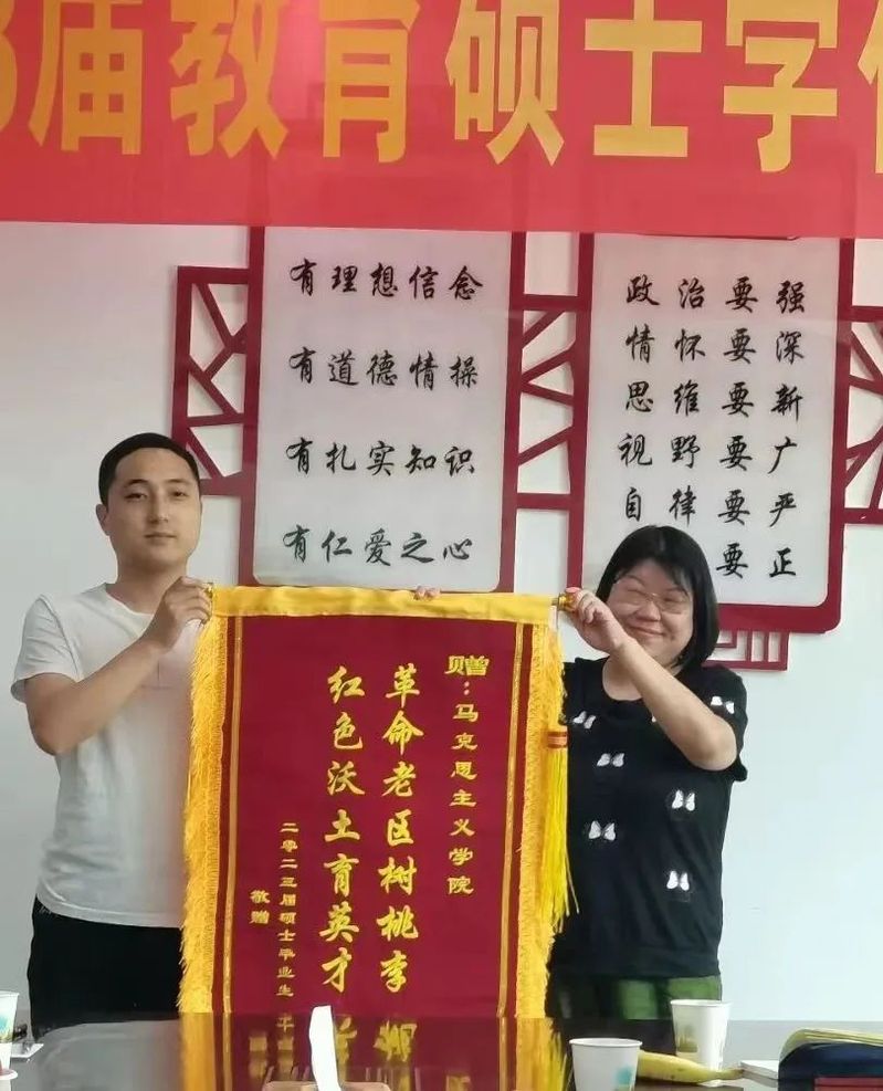 优秀毕业生代表学科思政20级毕业生王世枭鉴代表全体毕业生向我院赠送写有“革命老区树桃李,红色沃土育英才”的锦旗,以此表达对母校的深深眷恋、对老师辛勤培养的感激之情。