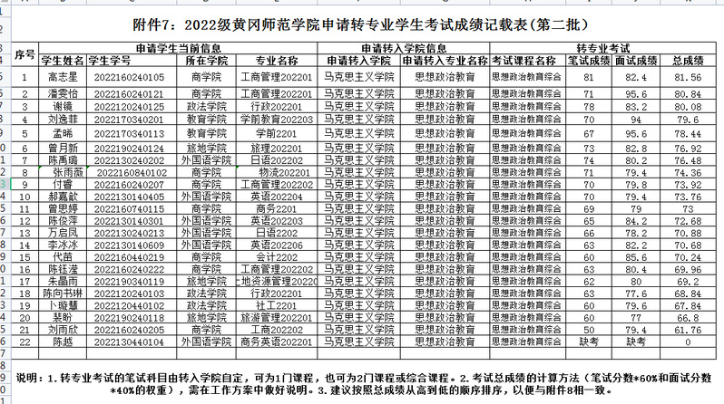 根据《2022级bevictor伟德国际1946第二次转专业工作方案》要求,2023年6月18日晚对申请转入我院各专业的学生组织了笔试和面试,现将成绩公示如下:
