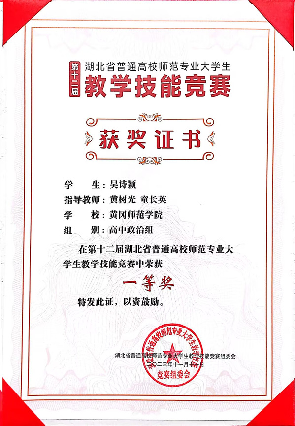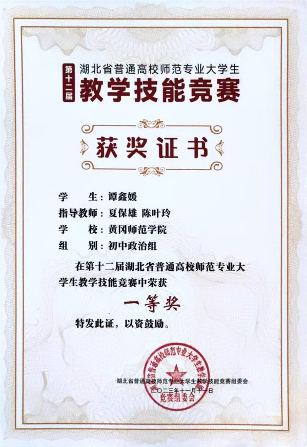 11月10---11日,第十二届湖北省普通高校师范专业大学生教学技能竞赛决赛在华中师范大学进行,来自全省13所院校的65名不同学科的优秀学子齐聚桂子山,切磋技艺,展示风采。其中政治组一共有6名选手参加现场决赛,我院思政专业21级谭鑫媛、吴诗颖两位同学经过激烈比拼,分别荣获初中政治组、高中政治组一等奖的好成绩。