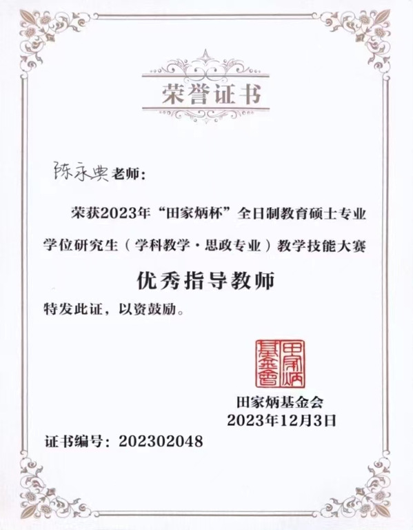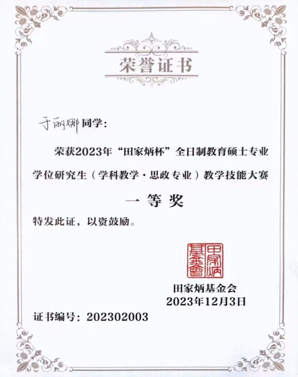 我校bevictor伟德国际19462021级学科教学(思政)专业于丽娜在2023年全国“田家炳杯”全日制教育硕士专业学位研究生学科教学(思政)教学技能大赛中荣获一等奖,陈永典老师获评优秀指导教师奖。