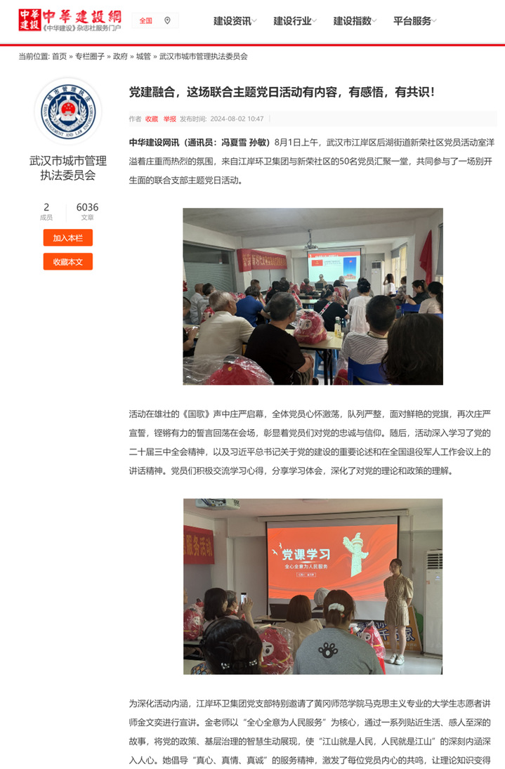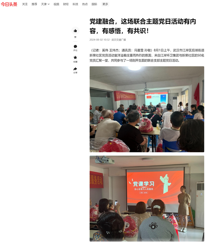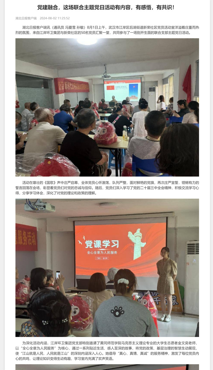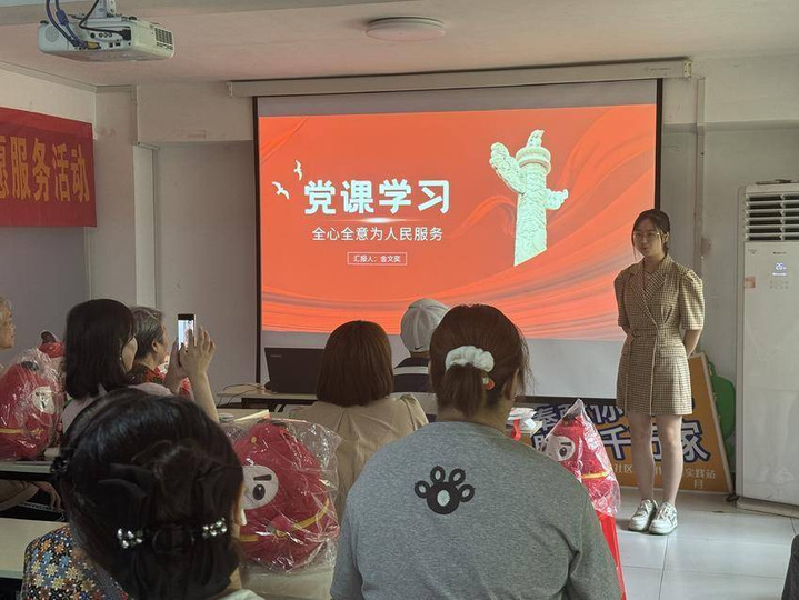 2024年8月1日,我院思想政治教育专业2101班金文奕同学主动参与到武汉市江岸区新荣社区的党日活动中,向来自武汉市江岸区环卫集团与新荣社区的50余名党员开展了党课宣讲。她以《全心全意为人民服务》为主题,饱含对党和人民的真挚情感,用贴近与会党员工作和生活实际的案例,用自己的专业知识和真诚态度让在场的50余名党员感受到了年轻人的激情与青春力量,充分展现了我院在人才培养中的实际成效,赢得了在场党员的一致好评。