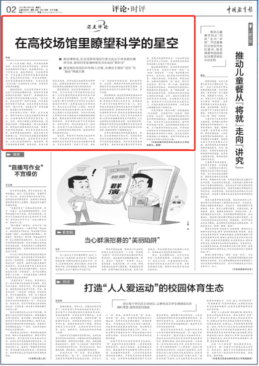 10月15日,我院副院长李威教授在《中国教育报》评论版头条发表文章《在高校场馆里瞭望科学的星空》。